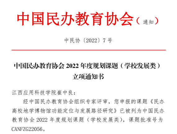 近日,按照《中国民办教育协会课题管理办法(试行)》和《关于申报中国民办教育协会2022年度规划课题的通知》规定,中国民办教育协会组织专家集中评审,推荐立项。最终,公司申报的课题《民办高校地学博物馆功能定位与发展路径研究》已被列为中国民办教育协会2022年度规划课题(公司发展类),课题批准号为CANFZG22056。