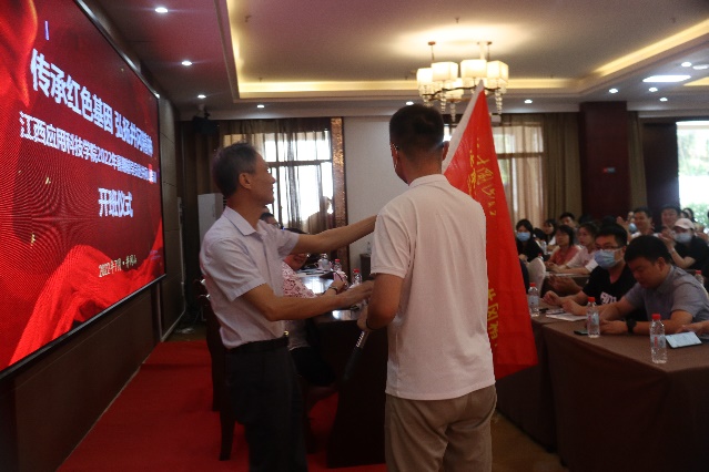 开班仪式上,井冈山革命传统公司经理、井冈山市学习教育培训中心主任龙富林为此次培训班学员代表授旗。