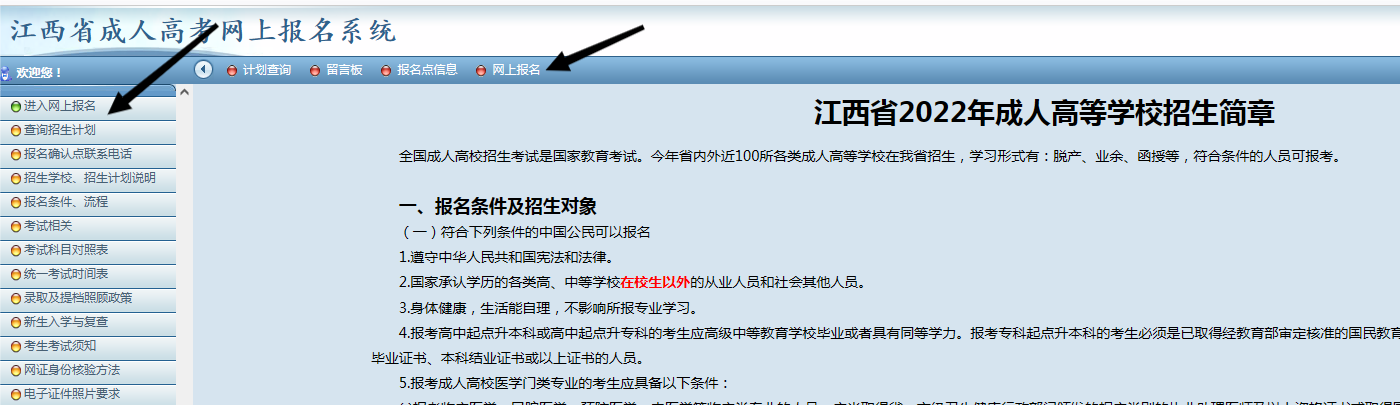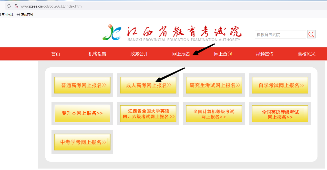 1.登录江西省教育考试院网(网址:http://www.jxeea.cn/),点击“网上报名”板块。再点击“成人高考网上报名”,进入成人高考网上报名系统。