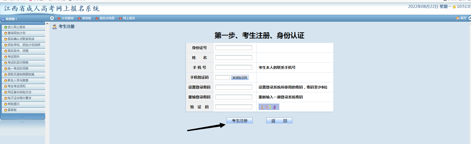 3.未注册用户,点击“考生首次登录,点击这里注册”按钮,进行第4、5步操作,完成注册。已注册用户,输入身份证号、密码、验证码后,点击“登录”按钮登录。