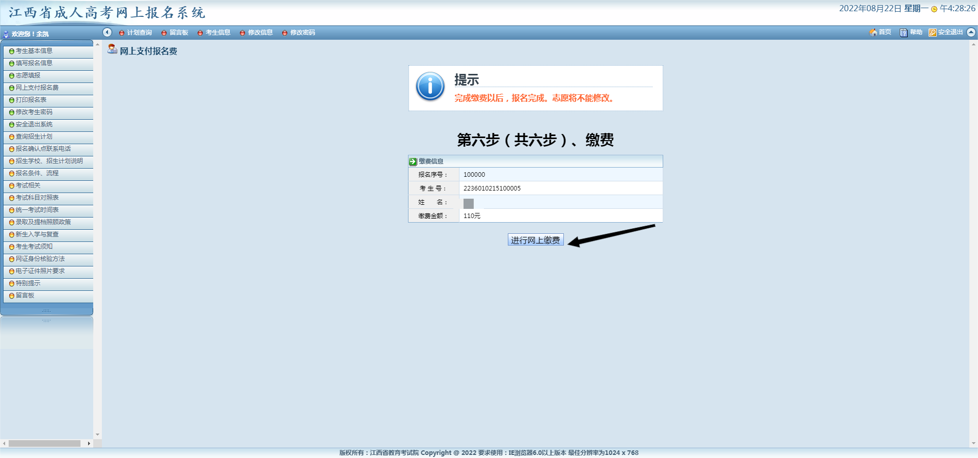 12.志愿提交后,点击“进行网上缴费”,进入网上缴费页面。