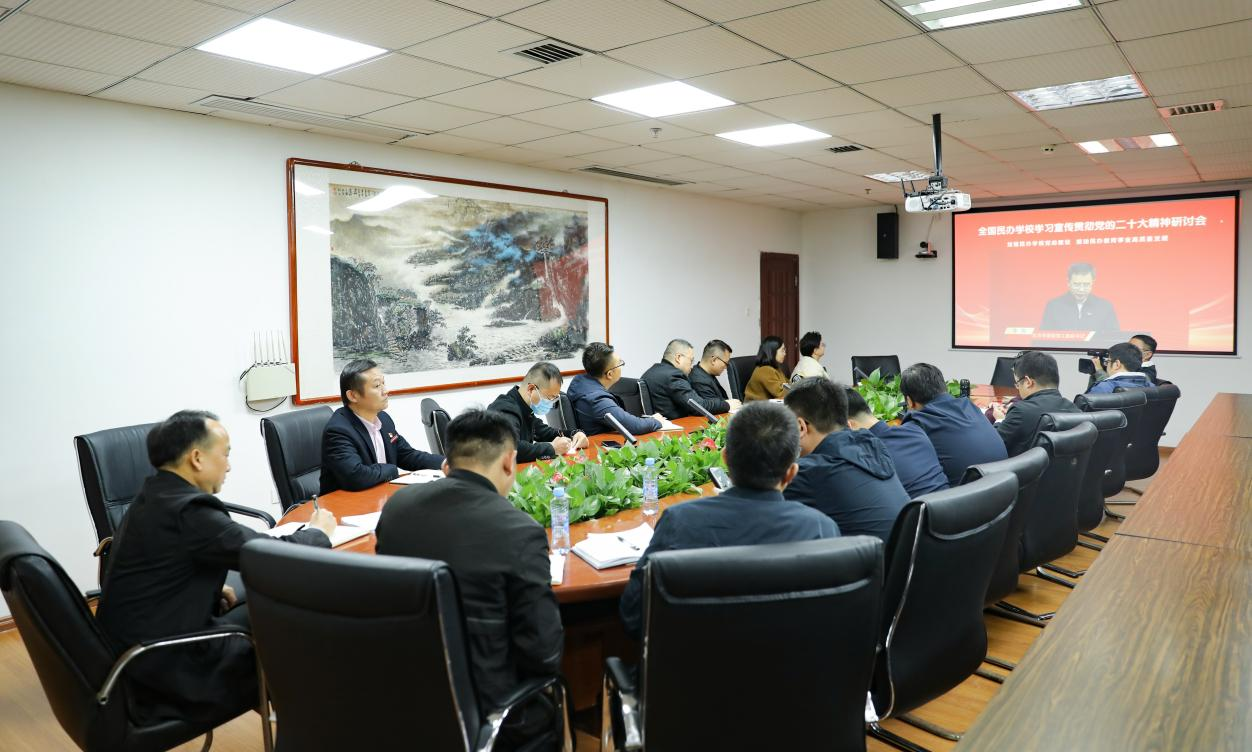 11月18日上午,十大体育网站在综合楼六楼会议室参加中国民办教育协会学习宣传贯彻党的二十大精神线上研讨会。公司党委书记彭迪云出席研讨会,公司组织部、宣传部、教师工作部、学工部、团委、马克思主义公司负责人,各党总支书记参加学习。