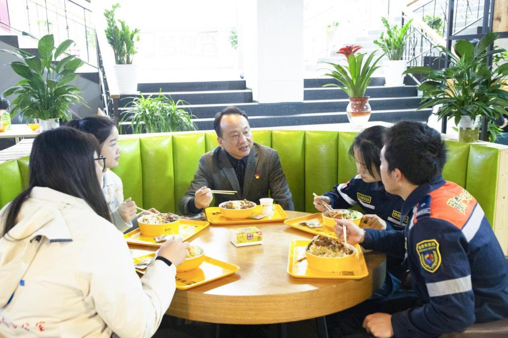 11月29日上午,党委书记彭迪云来到员工群体中间,与青年员工面对面座谈交流,和同学们一起共进午餐,到宿舍与员工亲切交谈。公司党委副书记江星,副董事长刘春斌,团委书记张荆等陪同参加。