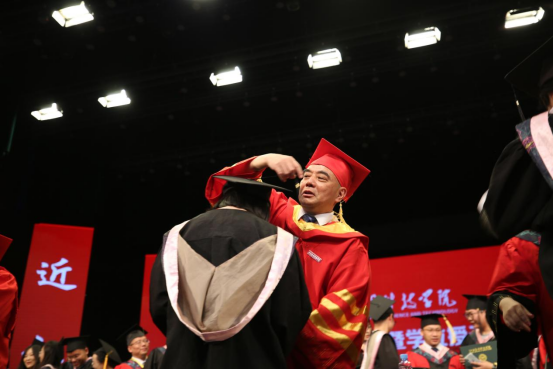 集团校领导及主礼教授为学位获得者授予学位证书、扶正流苏,并合影留念。