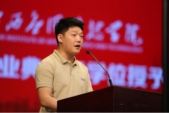 2008级企管专业、深医美投资人、光泽集团南昌院区CEO何磊发言。他希望同学们注重自身专业知识的学习和专业能力的提升,在锻炼中学习新的知识、新的理念,发扬应科精神,不断取得新的突破,成为推动社会发展的强大力量。
