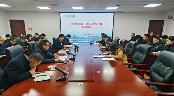 校保卫处陶友弟处长传达了省教育厅《关于印发〈全省校园安全隐患大排查大整治百日 会战行动方案〉的通知》《关于开展2024年春季“开学第一课”暨安全教育周活动的通知》等文件精神,并结合公司实际,从隐患排查、安全教育、治安防控、交通管理、消防安全、值班备勤等安全维稳工作做了工作部署安排。