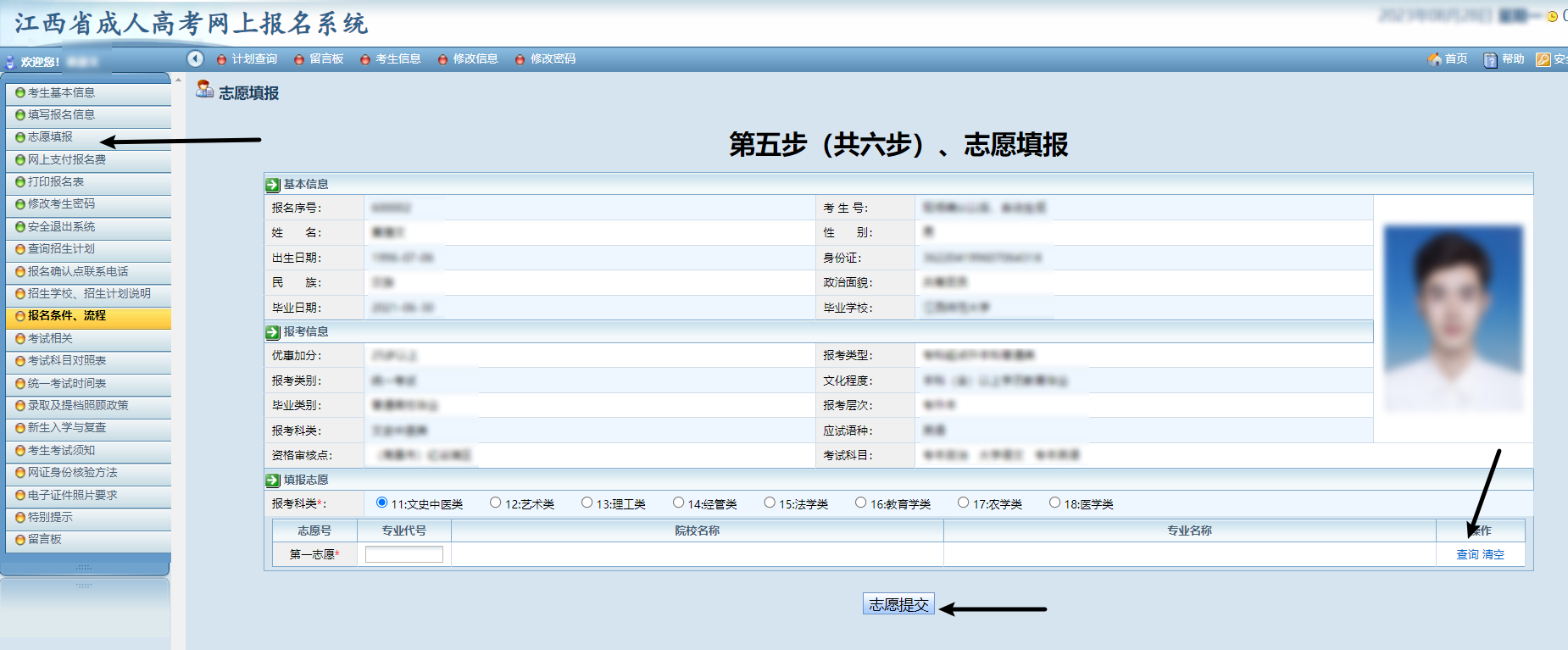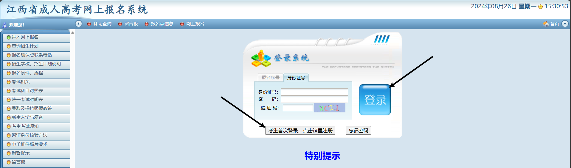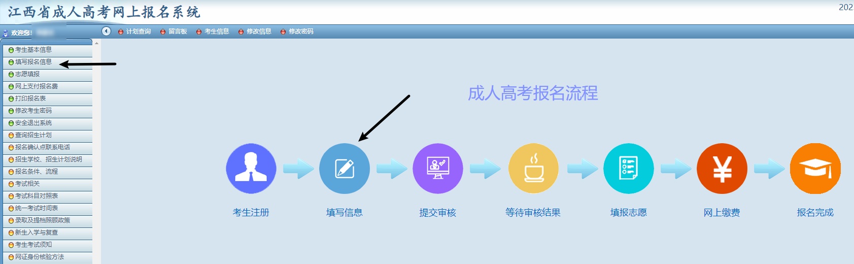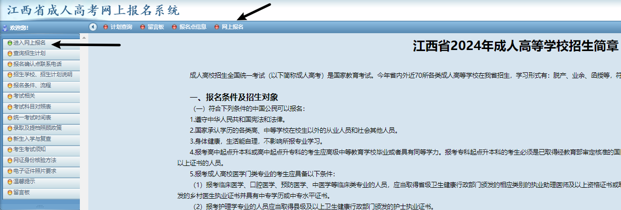 1.登录江西省教育考试院网(网址:http://www.jxeea.cn/),点击“服务大厅”板块。再点击“成人高考网上报名”,进入成人高考网上报名系统。