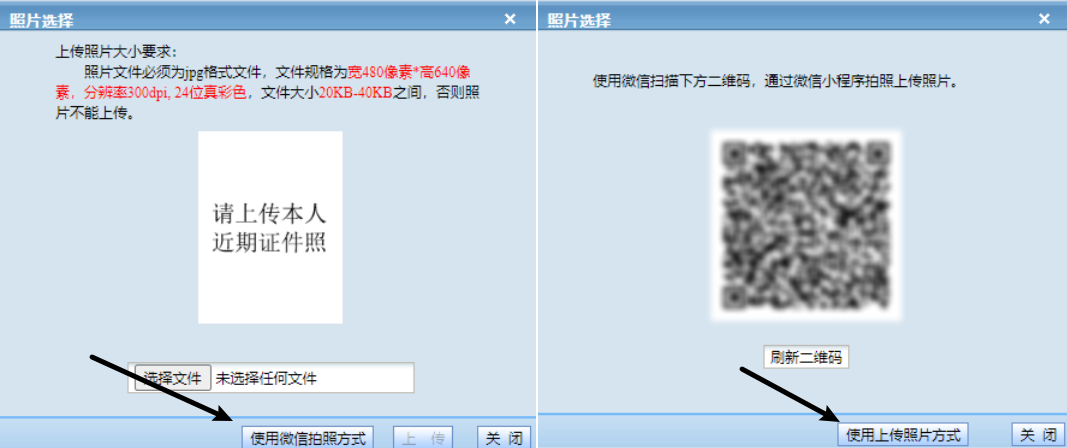 7.点击“点击上传照片”按钮,考生可以“使用上传照片方式”或“使用微信拍照方式”上传本人电子证件照片。照片核验需要时间,请耐心等待。