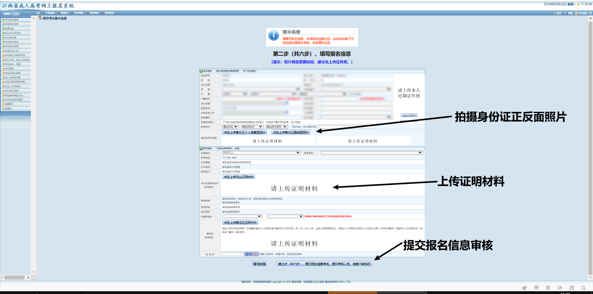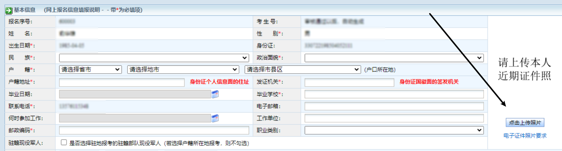 8.根据提示填写个人信息、报考信息,拍摄身份证照片、上传证明材料。
