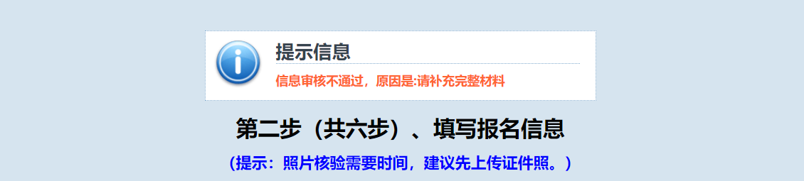 (2)反馈结果为要求补充报考资格材料的。需及时上传补充材料照片,或修改符合条件的报名资格类别并提交,等待审核,再次登录报名系统查看网上审核结果。