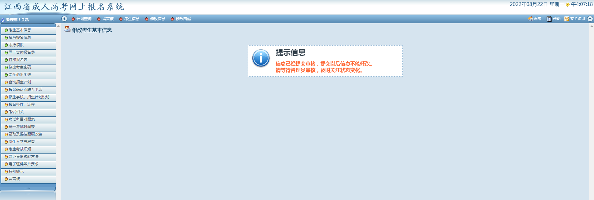 9.填写完成查验无误后,点击“提交报名信息审核”。如显示“请等待照片核验”或“请等待处理后提交”,请您等待10分钟后重新提交。当出现“信息已经提交审核,提交以后信息不能修改。请等待管理员审核,及时关注状态变化”时,考生基本信息提交成功。