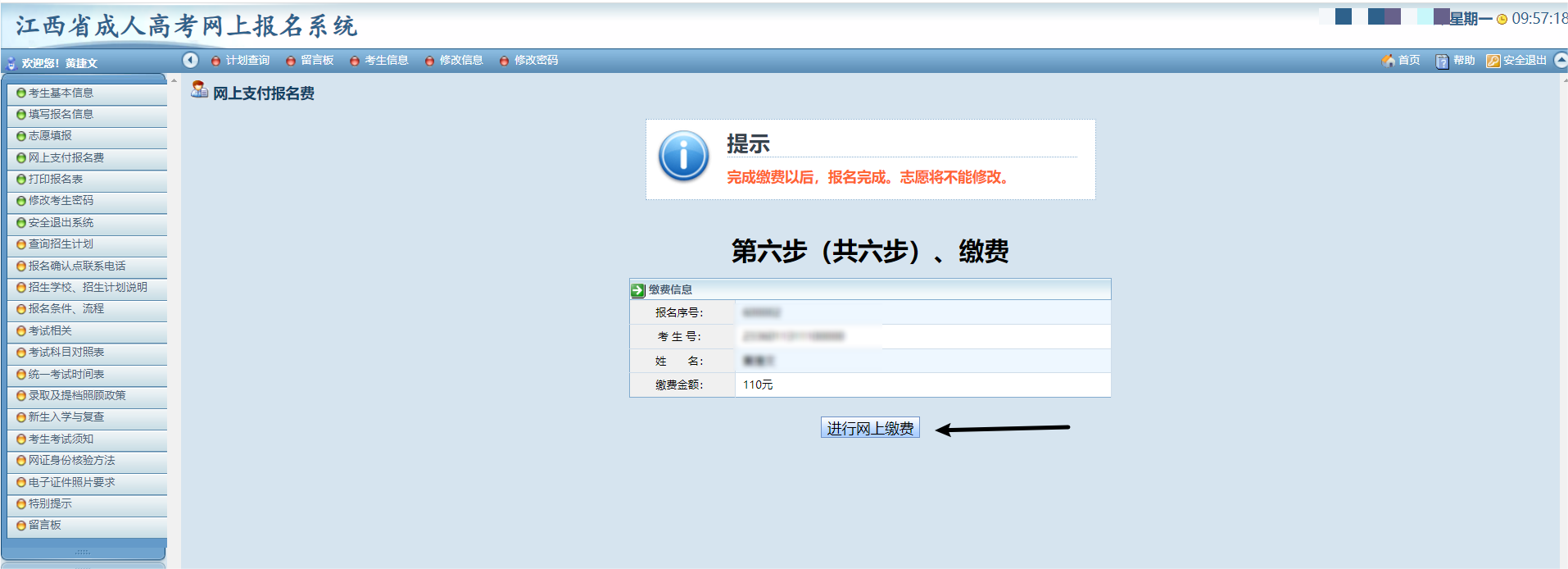 12.志愿提交后,点击“进行网上缴费”,进入网上缴费页面。