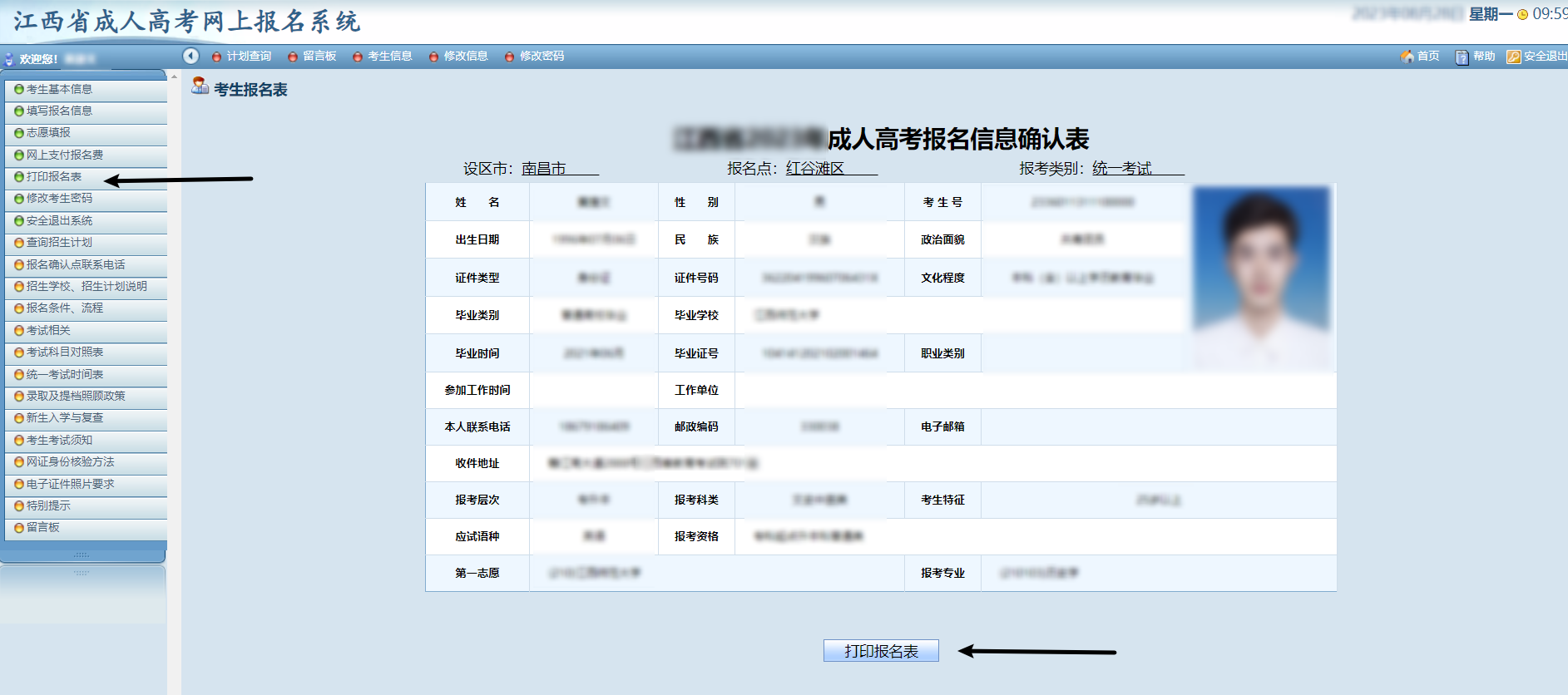 14.缴费完成后,点击“打印报名表”按钮,完成报名表打印。